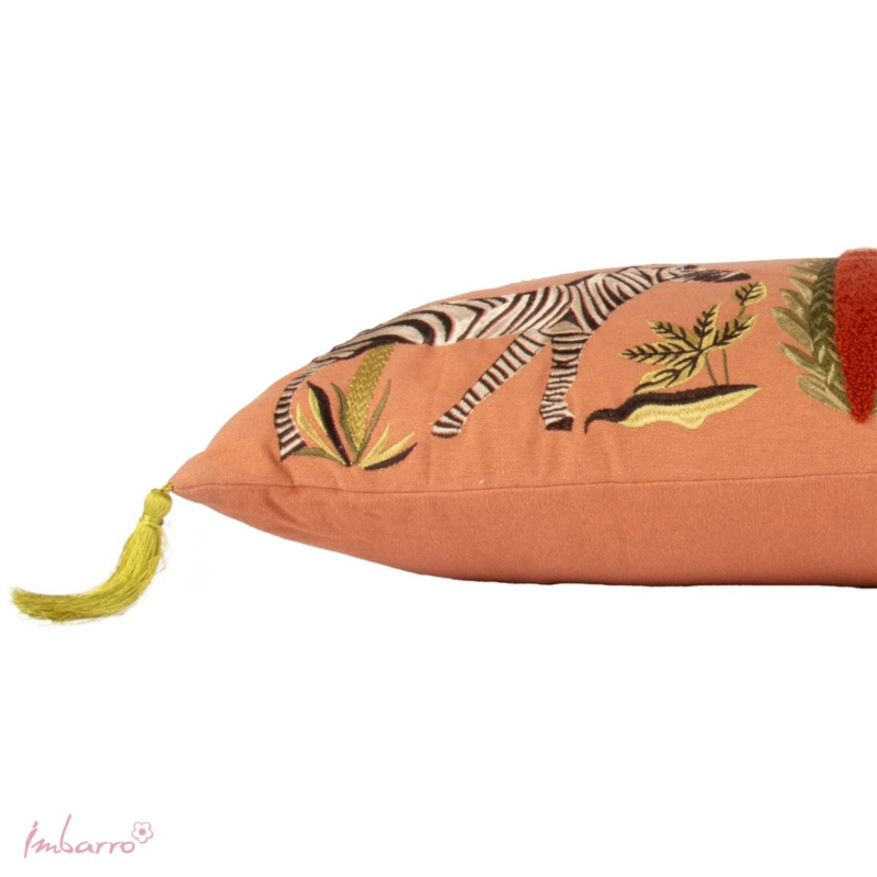 Als de avond valt, schitteren zebra’s onder de maan tussen wuivende palmbomen. Dit zachte kussen vangt dat moment met geborduurde strepen en een luxe touch. Een speels accent voor elke boho woonkamer of slaapkamer. | Kussen zebra – katoen – 35×60 cm | Langwerpig kussen met geborduurde zebra en speelse kwastjes. Ideaal als finishing touch op bank of bed